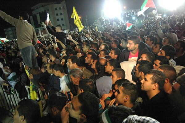 Unlike other political gatherings in the West Bank, the release of prisoners brings crowds that are a cross-section of society. Every economic class and religious background is present, along with flags from rivaling parties mounted on the same posts.