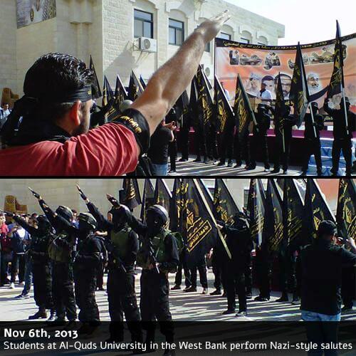 The Nov. 5 demonstration on the Al-Quds campus involved demonstrators wearing black military gear, armed with fake automatic weapons, and who marched while waving flags and raising the traditional Nazi salute. The demonstration took place in the main square of the Al-Quds campus, which was surrounded by banners depicting images of “martyred” suicide bombers.