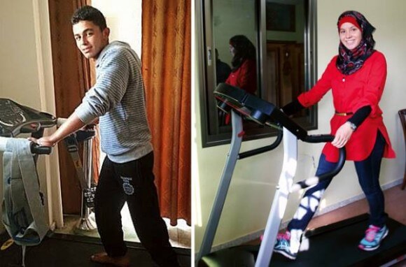 Yasmeen El Najjar and Mutussam Abu Kirsh train on treadmills (photo: Friday magazine)
