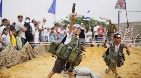 We’re used to hearing about the incitement of Israeli children from Max Blumenthal, who says indoctrination begins in the “spring season” of holidays when kids are taught about the enemies who surround them. Well the American Jewish community is getting the message. The Forward has published a shocking piece called, “When Israelis Teach Their Kids to Hate” with the picture above of children in the settlement of Efrat celebrating Israeli independence day, and another one of a child holding a giant rifle (at that link).
