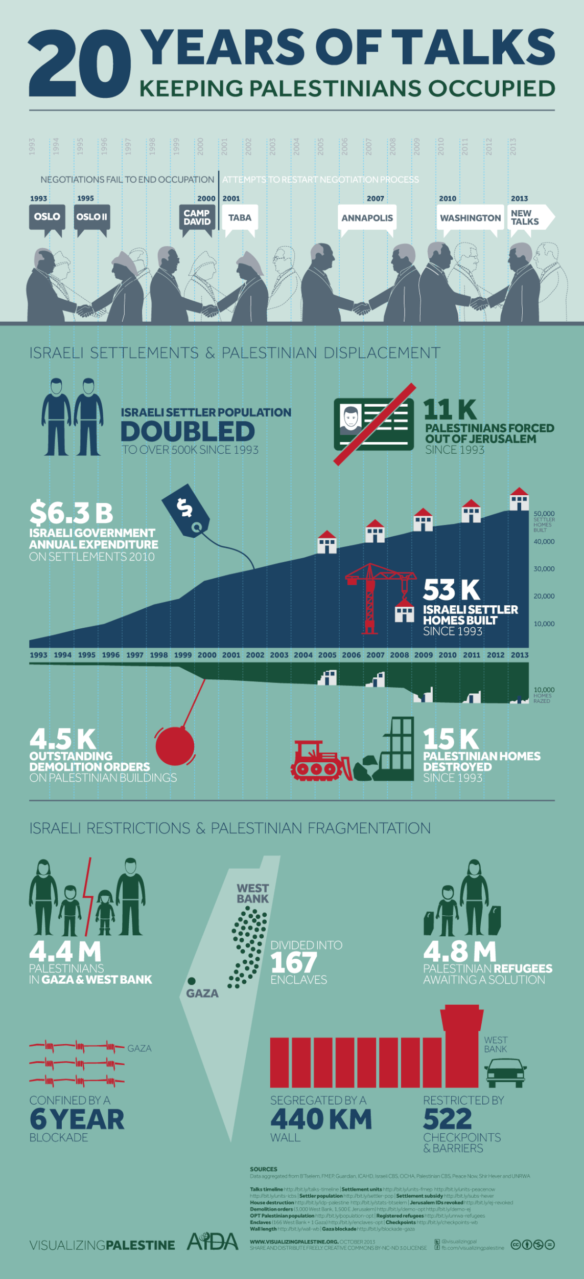 Since the peace process started 21 years ago Israel has destroyed 15 thousand houses and has orders to destroy 4,500 more Palestinian buildings in the occupied West Bank. They have doubled their number of illegal settlers and built 53 thousand homes for them. The West Bank is divided into 167 enclaves restricted by 522 check points, and segregated by a 440 km wall; Israel has taken more than 40% of the West Bank to serve the illegal settlements which is a clear violation of the Geneva Convention.
