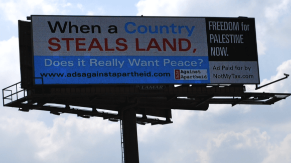 The ad is the first since the announcement last month that Ads Against Apartheid (AAA) was taking its campaign national. It’s working with NotMyTax.com, part of American Muslims for Palestine.