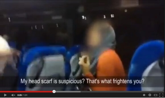 Woman: Suspicious? What do you mean by that? Explain to me what suspicious means. My head scarf is suspicious? That’s what frightens you? So get off [the bus].