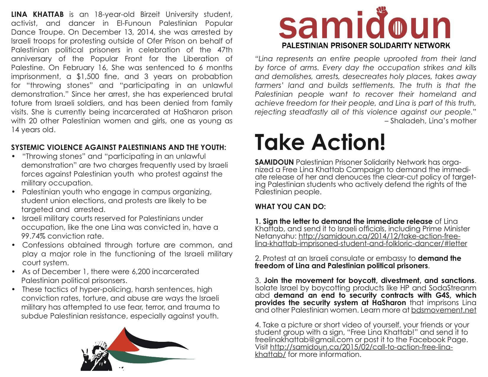 The students also handed out pamphlets with further information about Khattab and Palestinian political prisoners. A digital copy is embedded below.