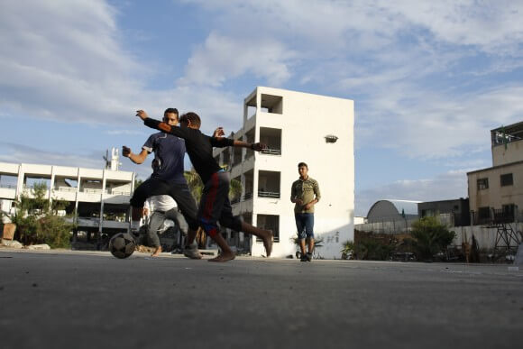 “There’s little obvious beauty inherent in the horror and difficulty of life in Gaza, but Jehad is keen to find it. While his city is broken and worn-out—“You can see how tired and destroyed everything has become here just by looking at the people’s faces”—his more recent photo essays show groups of boys playing football and men building wooden homes: “I became a war photographer by default, but I like capturing quiet daily life and the beautiful aspects of life in Gaza.”. After all, he says, “there are people making happiness from nothing, and who hold out hope for peace.””