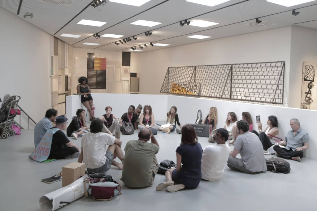 G.U.L.F. then called for a public meeting at the Israeli Pavilion, Israel’s permanent national pavilion at the Biennale, which they occupied for an hour discussing BDS and and PACBI, the Palestinian Campaign for the Academic and Cultural Boycott of Israel, and its “relationship with the art world”.