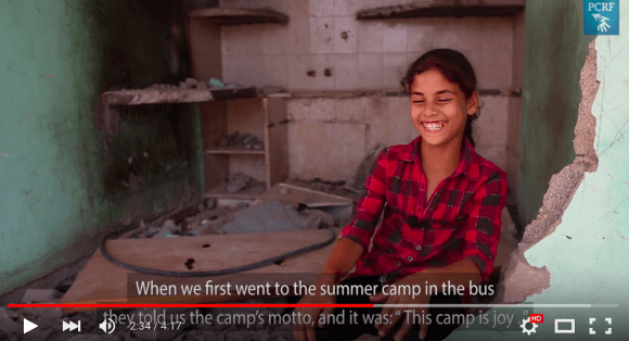 “When we first went to the summer camp in the bus they told us the camp’s motto, and it was “This camp is a joy” ” Ghouzalan, 7 years old from Khan Younis, Gaza, Palestine (Screenshot: Healing Psychological Wounds of Gaza’s War)