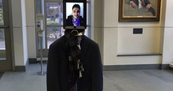 Ha’aretz reports that right-wing advocacy group StandWithUs sent a “robot-spy” to a panel discussion on Israel/Palestine held last week at Brown University, featuring MK Haneen Zoabi of the Joint Arab List as keynote speaker. The outlandish apparatus is shown in the photograph above wearing an overcoat and scarf beneath an iPad displaying the smiling face of Shahar Azani, the organization’s northeast executive director. It is said to have locomoted on wheels.