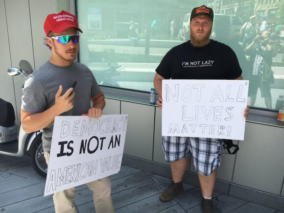 That’s why the Alt Right, people who believe race is the most important aspect of identity, tout “survival” as more important than the Constitution. They can thank Establishment politicians like George W. Bush, Dick Cheney, Barack Obama and both Clintons, Bill and Hillary, for prepping the American people for Trump’s message of fear and mean vibes. And it’s not just Spencer, by any means, it’s guys like Eli, 32, who came all the way from Alaska, and Austin, 23, who hails from Cleveland. Both were wearing Trump hats. Austin had a can of pepper spray on his belt, and a sign that read “Democracy is Not an American Value.”