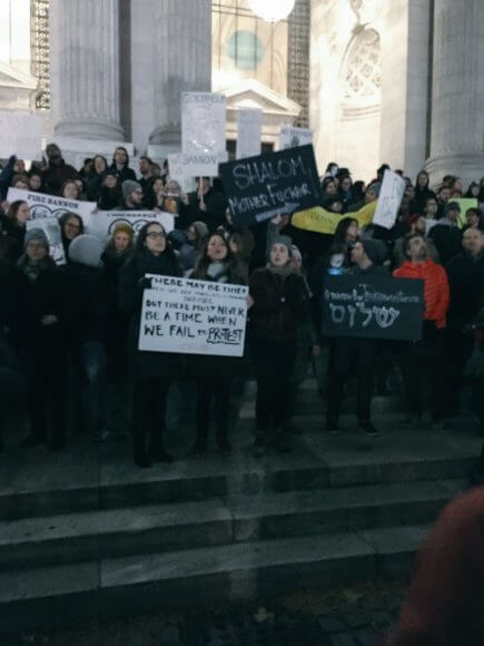When I arrived at the protest around 5 o’clock, it was already dark but the brightly lit roman columns of the New York Public Library shed light on the tightly packed crowd. IfNotNow member Tom Corcoran was revving up the crowd through a bullhorn: “This is a moment to speak out, to fight!” The mere mention of ZOA drew a chorus of boos, while an excoriation of Dershowitz elicited even more righteous anger.