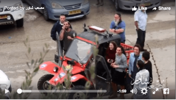 “Where are all the Arabs? They left you and joined us,” an Israeli settler yells in the video to Palestinians nearby while a group of young women accompanying him look on and laugh. “We go to heaven, you go to hell,” he adds.