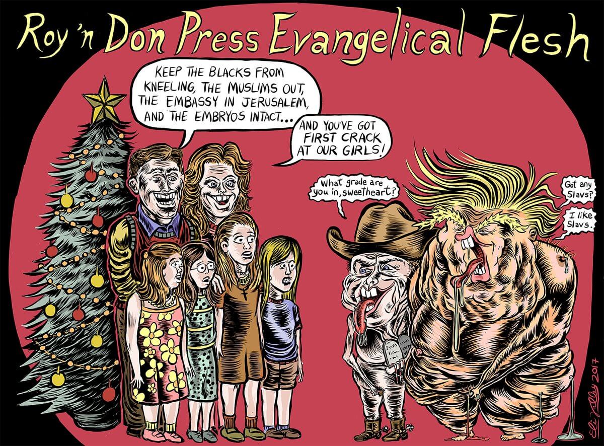 Cartoonist Eli Valley reduces all evangelicals to the very worst attitudes of some of them– racism and ignorance — and uses religious imagery to do it. When people do this to Muslims over support for Islamist terrorists or Jews over parasitical financiers, we call it Islamophobia or anti-Semitism.