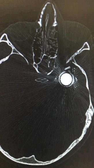 CT scan of the bullet in Mohammed Tamimi’s head. (Image via Nabi Saleh Popular Committee)