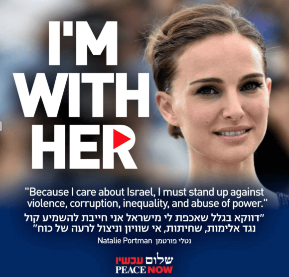 Another prominent ‘Liberal Zionist’ organization, Peace Now, has now started a Portman-support campaign called “I’m with her”, saying: “Because I care about Israel, I must stand up against violence, corruption, equality, and the abuse of power.”