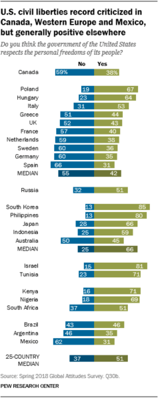 Next, here’s your creeping fascism index. Most people in most countries regard the U.S. as an enemy of civil liberties in the U.S. But not Israel!