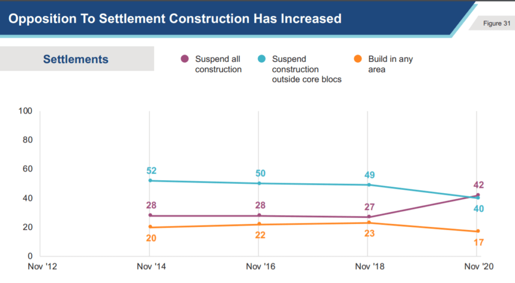Right alongside opposition to Netanyahu, opposition to settlements is increasing. Bear in mind that American Jewish political support for settlements stymied George H.W. Bush in the 90s when he tried to take on settlements, and Barack Obama in 2010-11. But that support is slowly eroding.