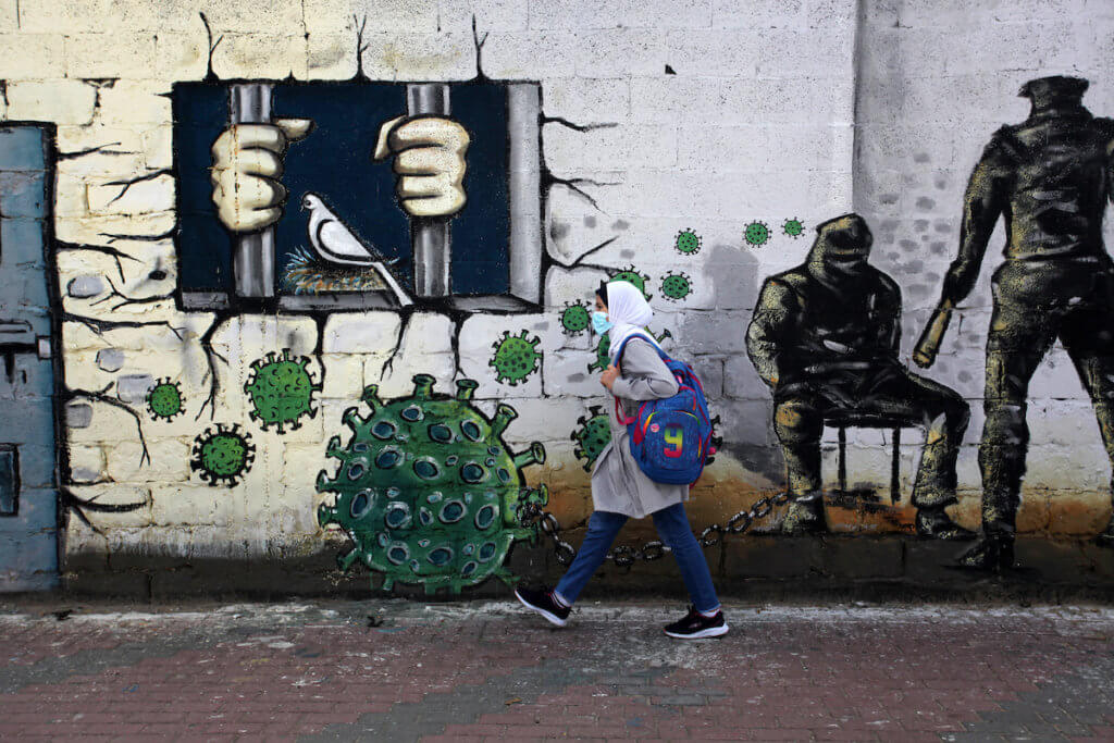 Palestinian student walks past a mural depicting the coronavirus in prison in Gaza City on November 4, 2020. (Photo: Mahmoud Ajjour/APA Images)