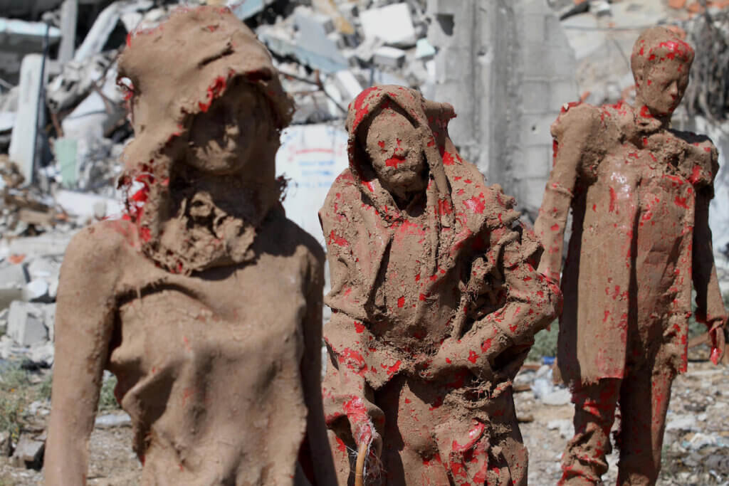 In the young man’s memory, Sabbah created Tahalok, which means “worn out” in Arabic. In the exhibition, seven clay figures trudge away from Shuja’iyya toward the beach, men and women, children and adults who are fatigued-looking and stained with red. One of the figures has since been moved to the West Bank and is on display at the Banksy Museum in the Walled-Off Hotel in Bethlehem. The other figures are stored in his Gaza home, where some of his relatives now live.