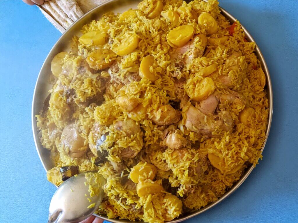 On the other side of the border, I missed my friends too. I remembered the last time they visited me before I traveled and my mother prepared qidra for us. The word qidra in Arabic means a clay vessel. The dish is named so because it is made of rice that is baked in the qidra itself. My mother would cook the rice with pieces of meat stewed in garlic, chickpeas, cinnamon, cardamom, and cumin.