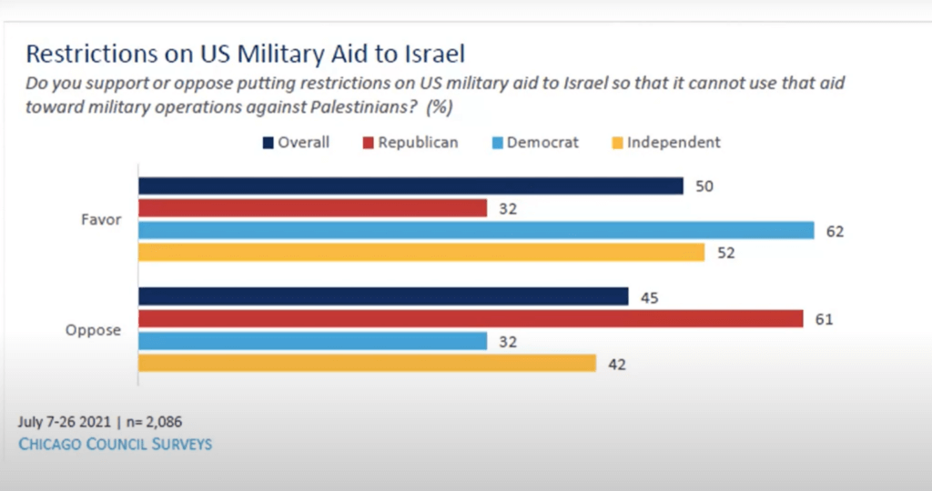 Others have found the same result. Gallup and Pew polls show that a majority of Democrats now want to pressure Israel. They are joined by the Chicago Council on Global Affairs poll released in August, showing that by 62 to 32 Democrats support restricting military aid to Israel, and overall half of Americans take that position.