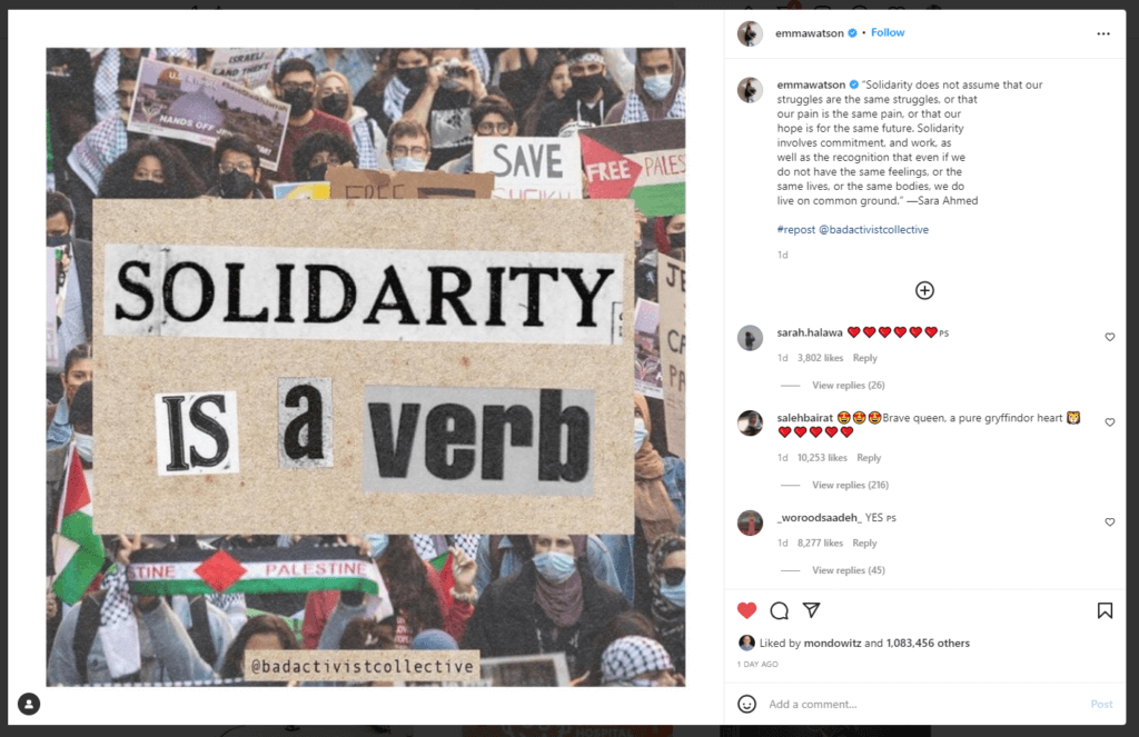 Yesterday the British actress Emma Watson, who is an activist on gender issues and has 64 million followers on Instagram, reposted an image from a Palestine rally last May with the message, “Solidarity is a verb,” and a quote about solidarity from Sara Ahmed, the feminist scholar.