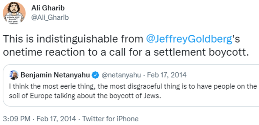 And the reason it’s possible to make BDS all-but-illegal in so many states is because Jeffrey Goldberg and hasbara culture claimed boycotting Israel was reminiscent of the Nazis. And that’s also why Ben and Jerry’s are turned into Nazis for boycotting the settlements.