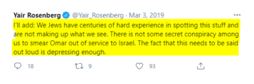 That question is not asked, because it is Never Again journalists who are the authority on antisemitism and the antisemites. “Ilhan Omar Knows Exactly What She Is Doing” was Bret Stephens’s verdict. And similarly, here is Yair Rosenberg being a Never again journalist on the Omar controversy, “demonstrating” that she has antisemitic intentions.
