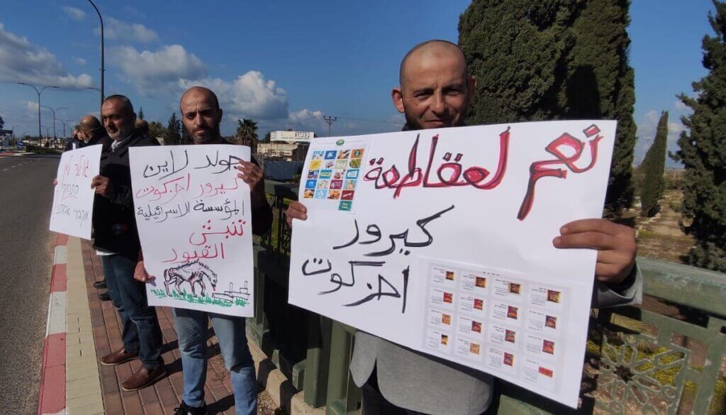 The demonstrators carried signs in Arabic, Hebrew, and English, calling for the cemetery to be respected and not to be damaged. Some of the signs directly blamed the companies involved, “Kirur Ahzakot” and “Gold Line”, along with the Israeli establishment, for harming the cemetery, and called for a boycott of their products.