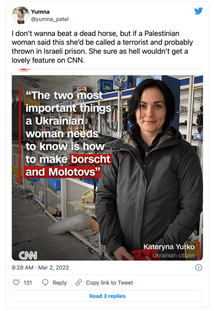 What was even more shocking than these racist, harmful, and exhausting narratives being perpetuated on mainstream news networks, was the blatant double standard when it came to reporting in Ukraine vs. Palestine.