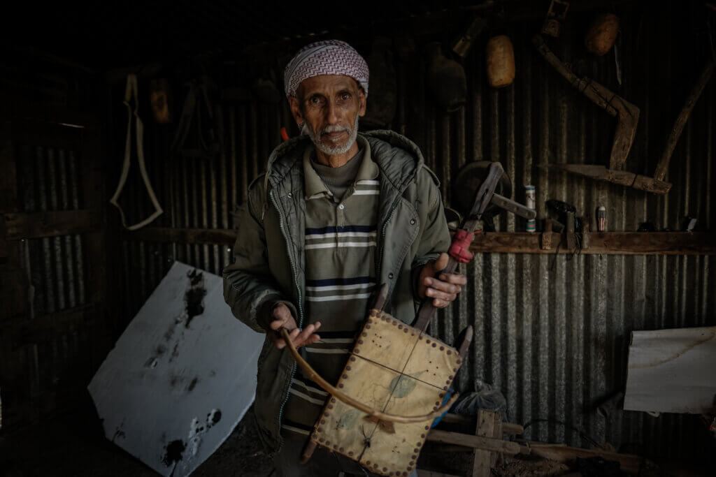 In a warehouse in Gaza City, 50-year-old Salah Dibari keeps an array of old antiques from the time of the Nakba, including a Rabab, a popular musical instrument used by his Bedouin ancestors from Beer al-Sabe in the al-Naqab (now known as the Negev desert).