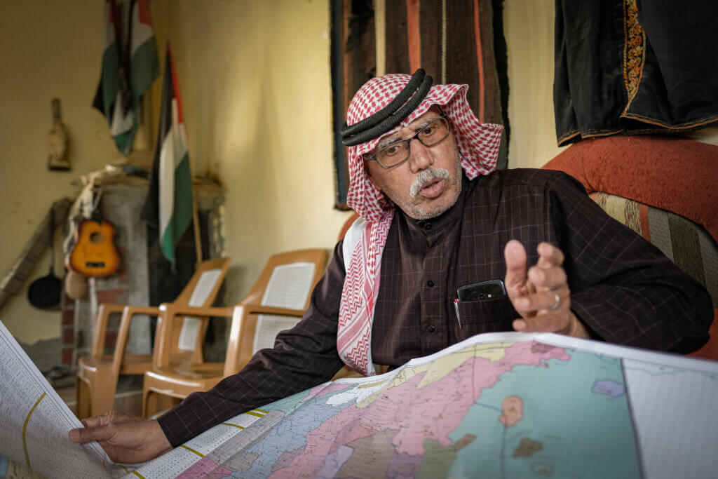 Awdah al-Amouri, 45, the head of the Bedouin council in Gaza, is also originally from the Beer al-Sabe area. His home is strewn with antique items his family carried with them as they fled to Gaza during the Nakba, and maps of what Beer al-Sabe used to look like before the establishment of Israel.