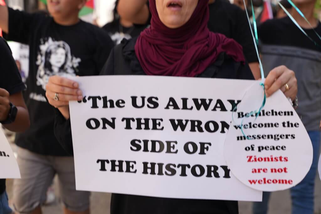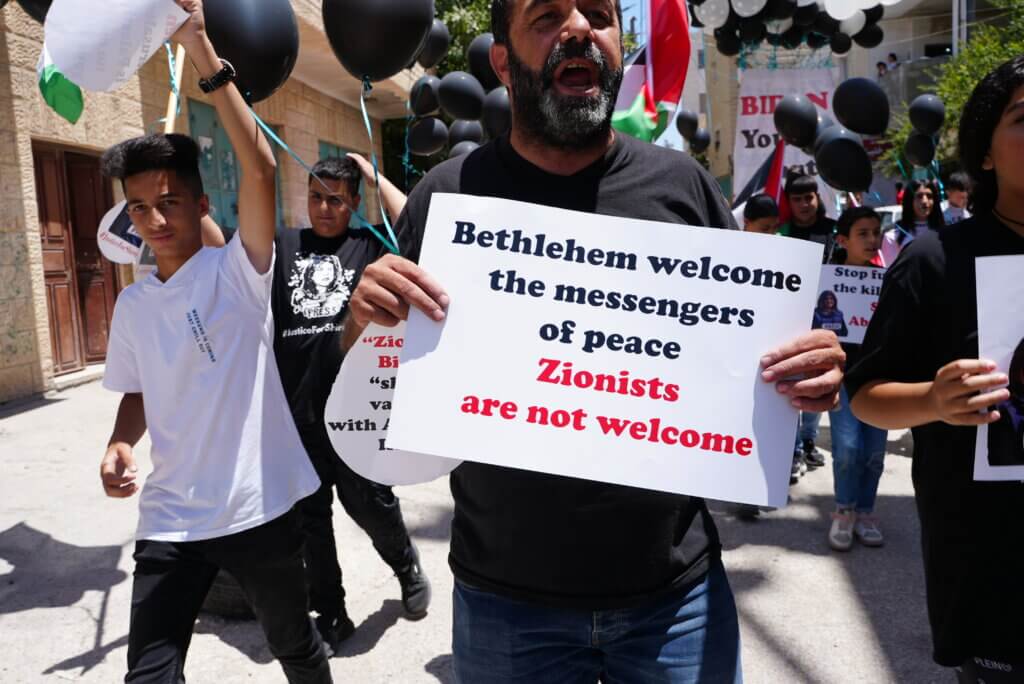 At least two separate protests took place in the city, including near the Aida Refugee Camp, where Palestinians chanted “America is a terrorist state,” and held signs saying “Zionists not welcome,” along with photos of slain Palestinian-American journalist Shireen Abu Akleh.
