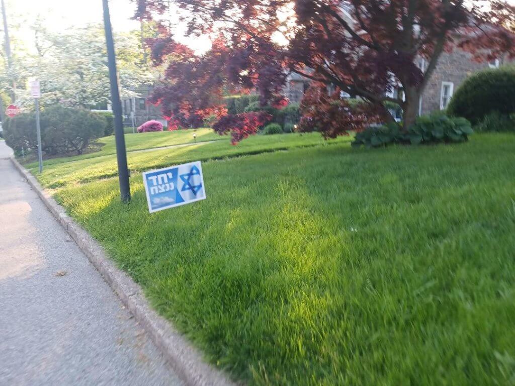 I’ve been visiting my mother in the Philadelphia suburbs, so I’ve been inundated by pro-Israel propaganda. Walking the streets I see many posters about Israeli hostages and standing with Israel. Like these outside the Mainline Reform Temple in Wynnewood (below), or the poster at a private house in Bala Cynwyd (above), sounding the Israeli battle cry, “Together We Shall Win.”