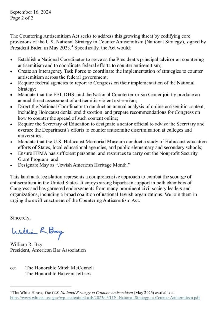 But he pointed out that Bay’s letter was worded carefully to say the “ABA’s policy on antisemitism supports most of the key provisions” of the Countering Antisemitism Act, not all.