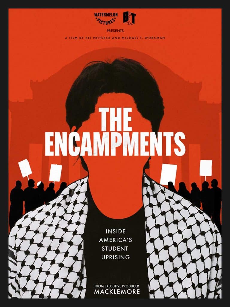 “Israel has traumatized us…forever,” says Bisan Owda, Palestinian journalist and activist, seated in the sand against a backdrop of tents in Gaza. This clip from Owda’s social media account is embedded early in The Encampments, a new documentary directed by Kei Pritsker and Michael T. Workman. What Owda and others in Palestine endure firsthand, millions of us witness in the palms of our hands over and over and over again. How does one respond to the trauma of witnessing the Israeli military starve and massacre innocent civilians with artillery and weapons purchased with our tax dollars and school tuitions? That is the question at the heart of The Encampments.