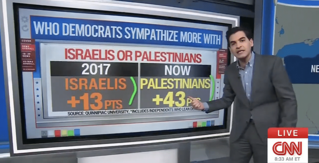 On his screen, he brought up polling from Quinnipiac. In 2017, Democrats sympathized with Israelis over Palestinians by 13 points. Now, Democrats sympathize with Palestines over Israelis by 43 points.